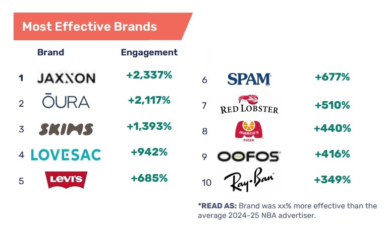This performance spans a diverse range of advertisers. Emerging apparel brands stood out as some of the year’s top performers, with Jaxxon seeing a +2,337% engagement lift and smart ring maker Oura achieving +2,117% greater per-person, per-second engagement than the average NBA advertiser.