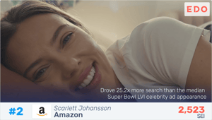 A big winner was Dolly Parton, who starred in a spot for T-Mobile that also featured her goddaughter, Miley Cyrus. Dolly generated 25 times more searches than the median in-game Super Bowl celebrity ad appearance. Close behind was Scarlett Johansson, who starred with husband Colin Jost in an Amazon Alexa ad. The newlyweds did well together but while Colin did 4 times better than the rest of the field in online inquiries, Scarlett drew 24.5 times more search activity.