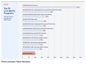 NCAA programming took four of the top 10 live sports programming spots in 2021. Further, EDO found that NCAA football and basketball programming comprised nearly half (eight) of the top 20.